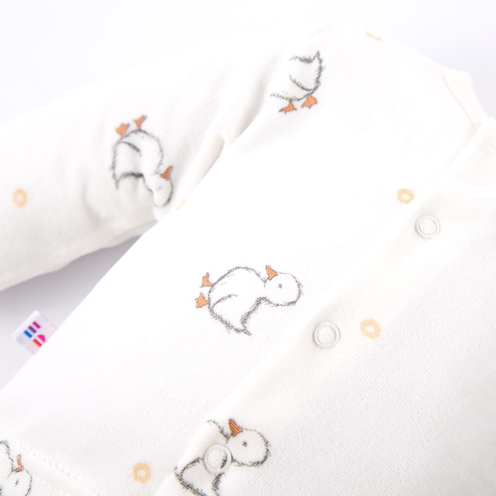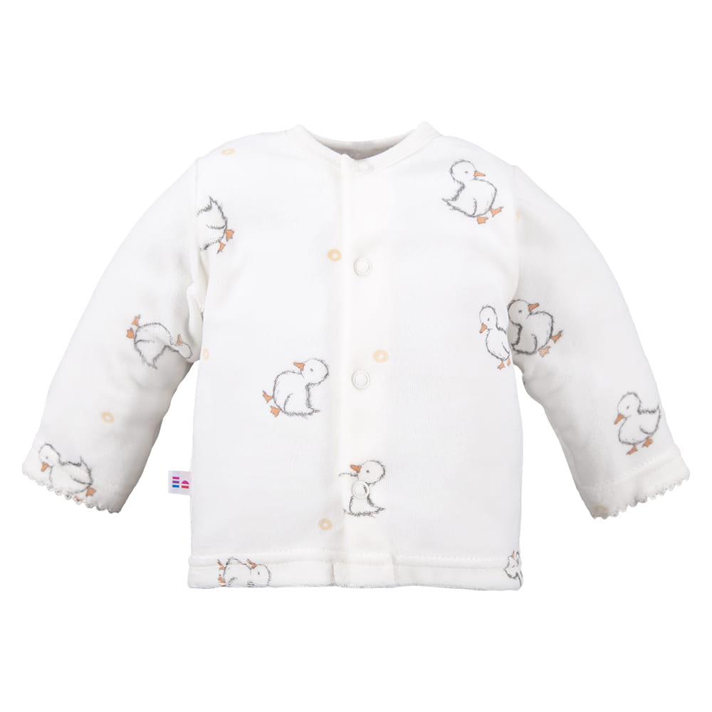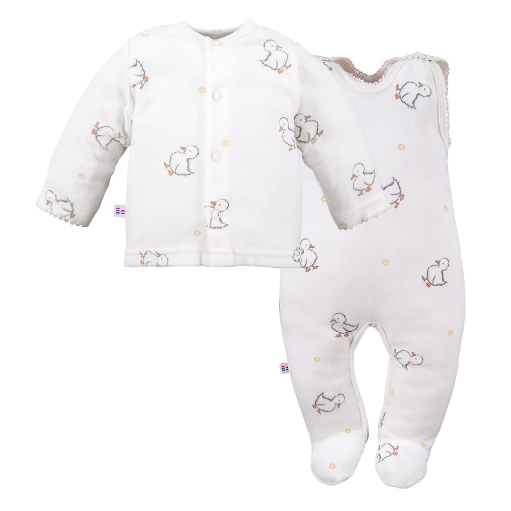 A baby set consisting of a romper and a kimono shirt with decorative duck print, made of soft and pleasant-to-touch velour. Baby sets are very comfortable and perfect for the first months of life. Sets are a great choice when preparing baby layette.