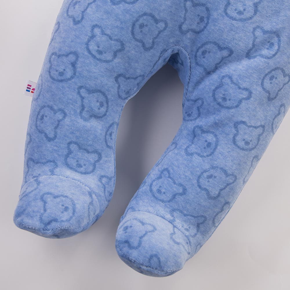 The blue baby velour jogger with feet with a cute bear pattern are a comfortable and practical choice for newborns and infants. Made of soft velour, they provide warmth and comfort for everyday wear and sleep. The pressure-free waistband gently adapts to the baby’s tummy, ensuring maximum comfort without squeezing.