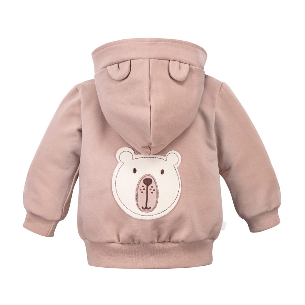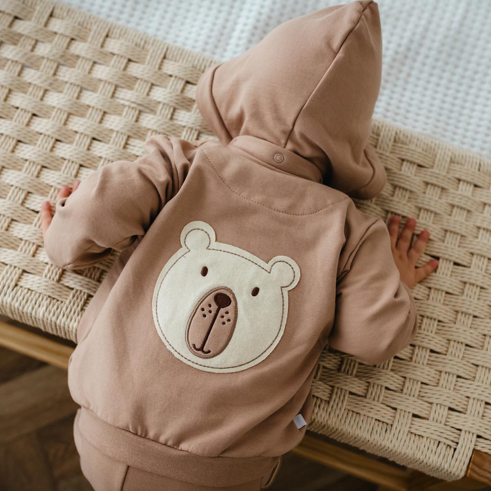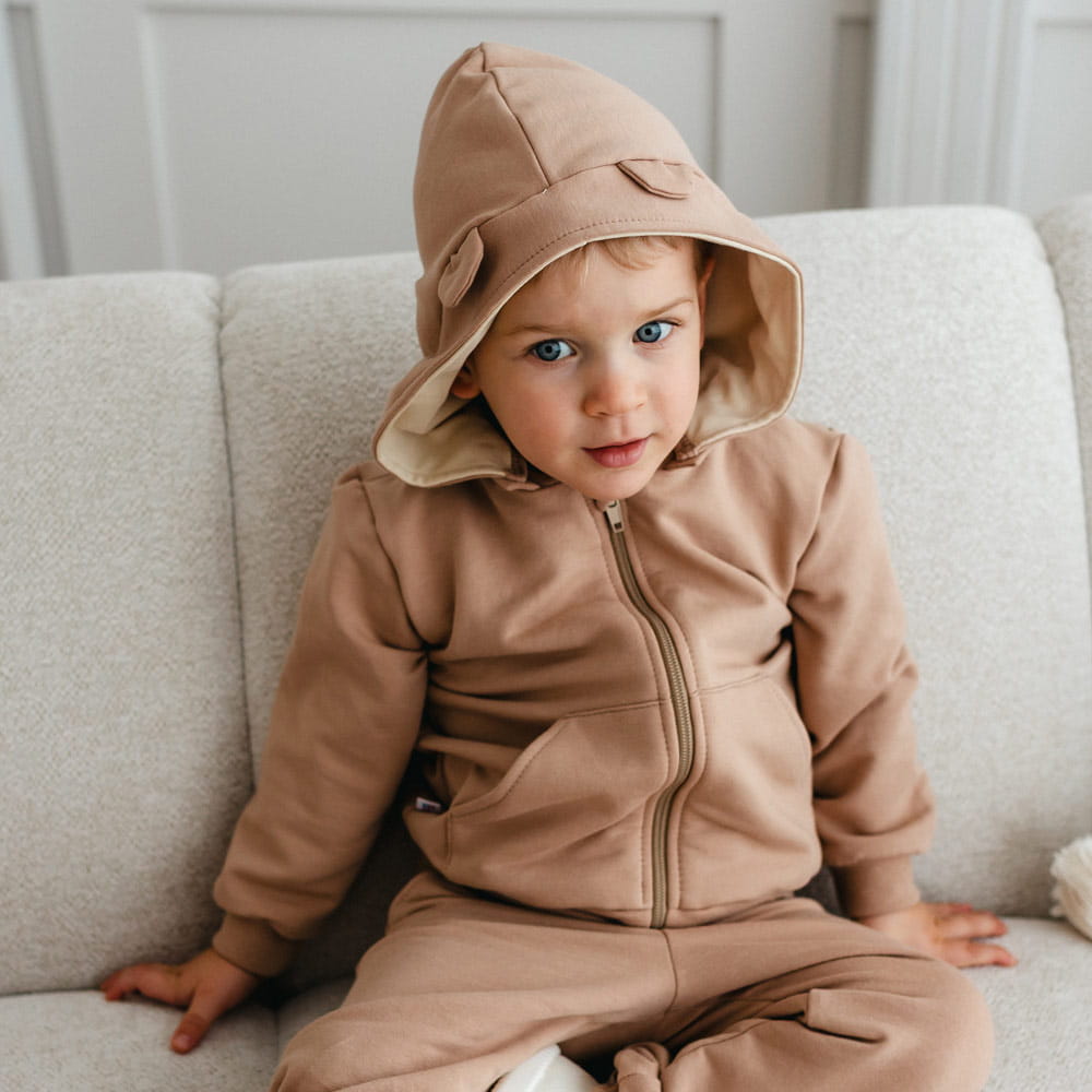 The Beige Boys' tracksuit from the Beary Cool collection is designed with comfort and style in mind. Made from soft and pleasant cotton fabric, this tracksuit set includes a hooded sweatshirt and matching pants. The hood is detachable, allowing for easy customization based on the weather and occasions. The back of the sweatshirt features a charming embroidered bear wearing a beret, a signature motif of this collection. This tracksuit is perfect for everyday strolls and active play.Why Choose the Eevi Kids' Tracksuit?