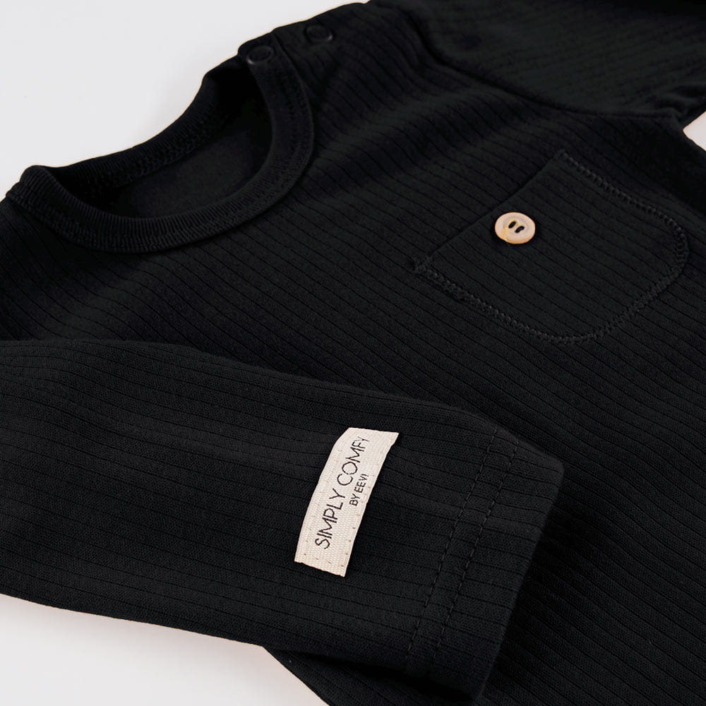 Classic baby bodysuit from the Simply Comfy collection in elegant black with ribbed texture is a perfect choice for toddlers. The small front pocket adds charm and subtle style, while the universal cut ensures comfort for everyday wear and special occasions.