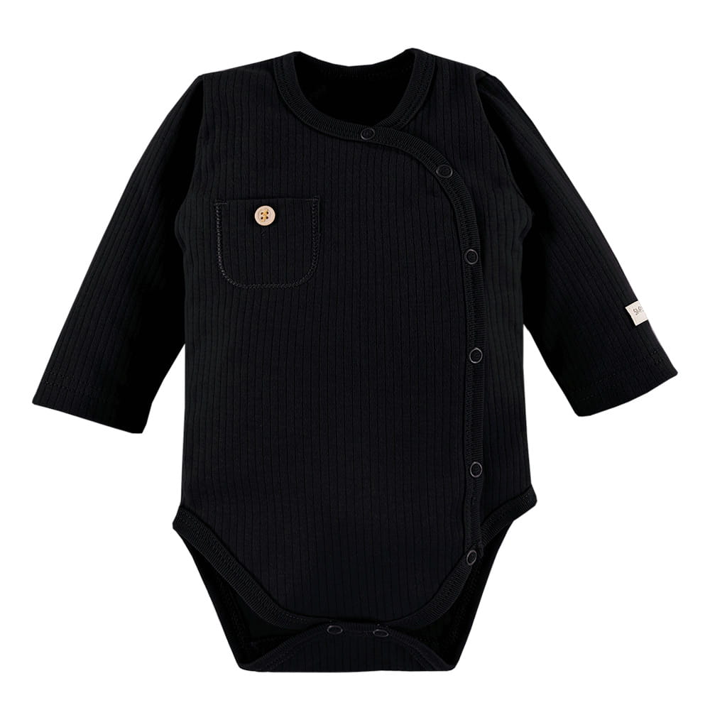 Snap baby bodysuit from the Simply Comfy collection in classic black with ribbed texture is a practical and comfortable choice for toddlers. A small front pocket adds charm and subtle style. Functional snaps make dressing and changing quick and hassle-free, while the simple, elegant design is perfect for everyday wear and special occasions.