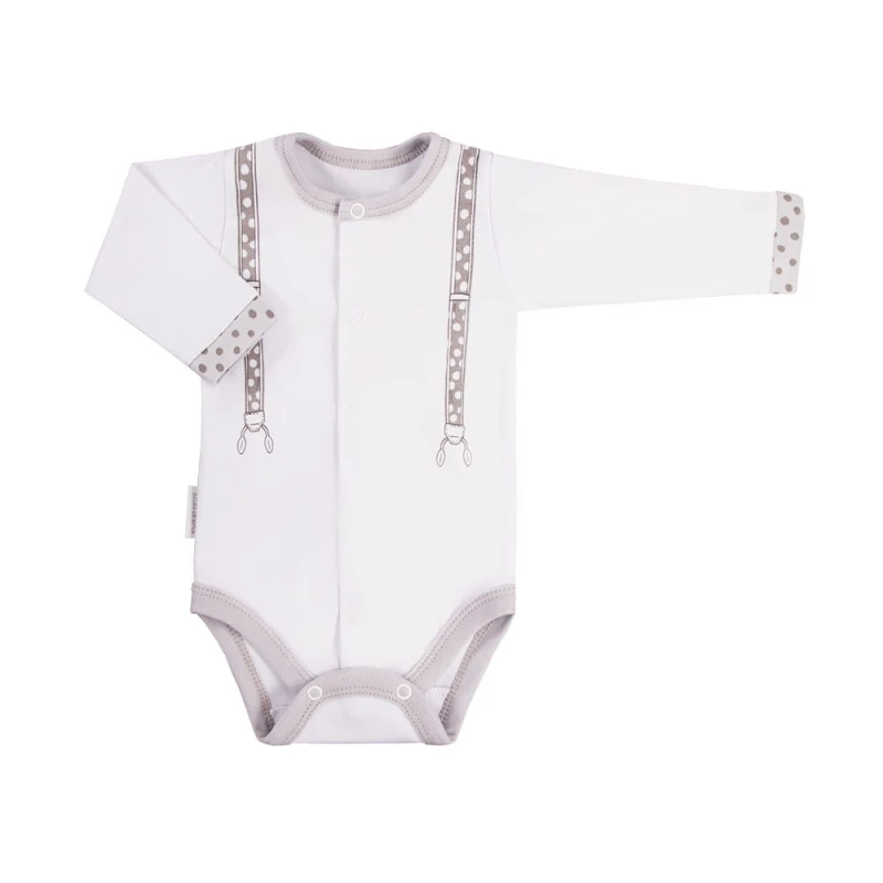 Bodysuit cardigan with long sleeves from "Chic" collection sewn from soft and pleasant to the touch knit. On the front there is a decorative print. The cut allows it to be fully unbuttoned, making the cloth functional and comfortable. Perfect in the first months of life. Finished with a soft piping. Snaps used in our products do not contain nickel. Made in Poland, certified "Safe for children". 100% Cotton