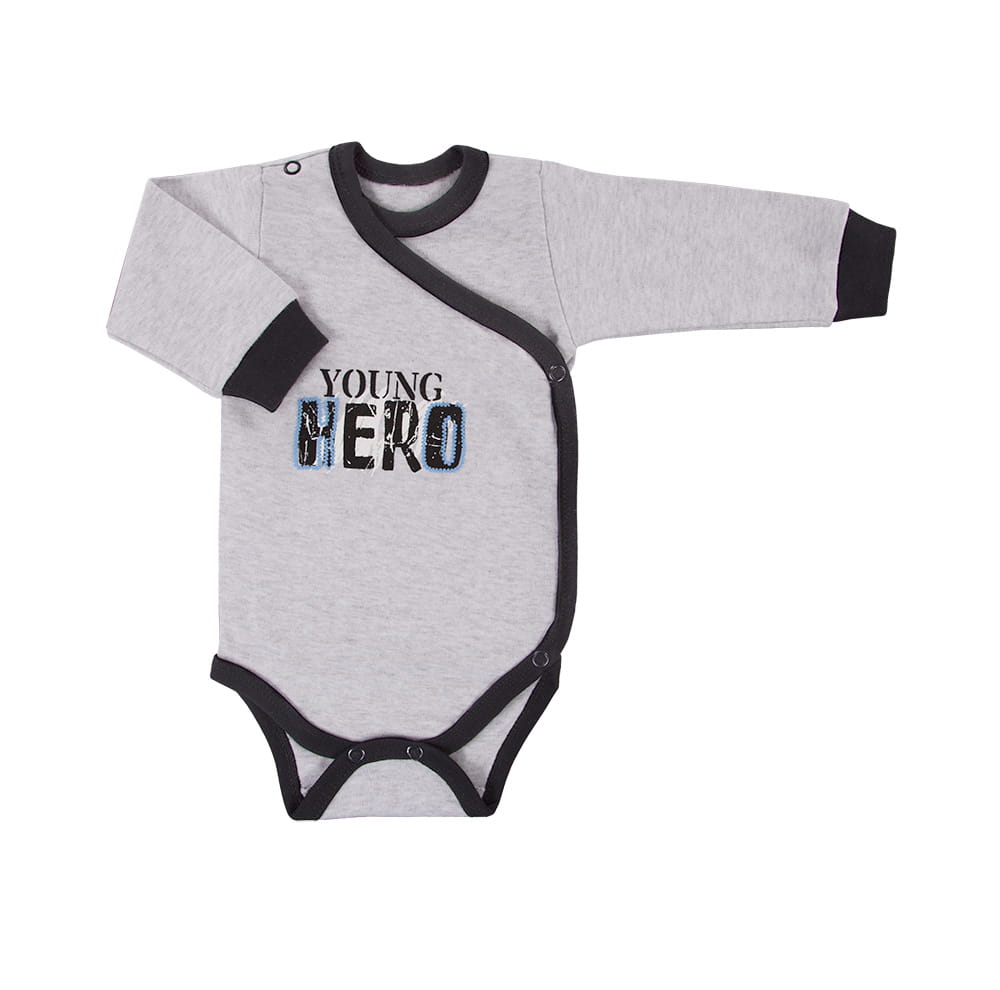 Bodysuit cardigan with long sleeves from POWER collection made from soft and pleasant to the touch cotton knit. At the front there is a small inscription. The cut enables full opening, making the body functional and comfortable. Finished with a soft contrasting trim and welt at the sleeves. Baby bodysuits are perfect for the first months of a child's life and belong to the most frequently chosen assortment by mothers.