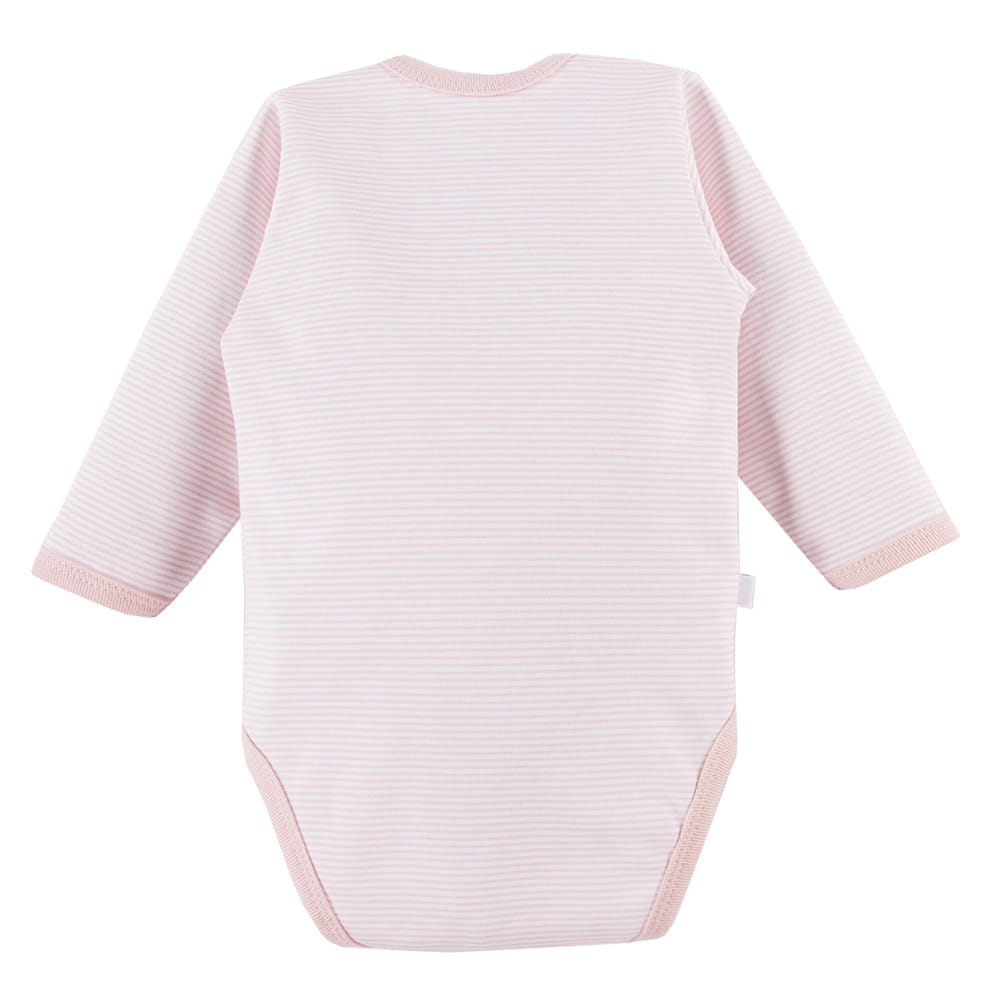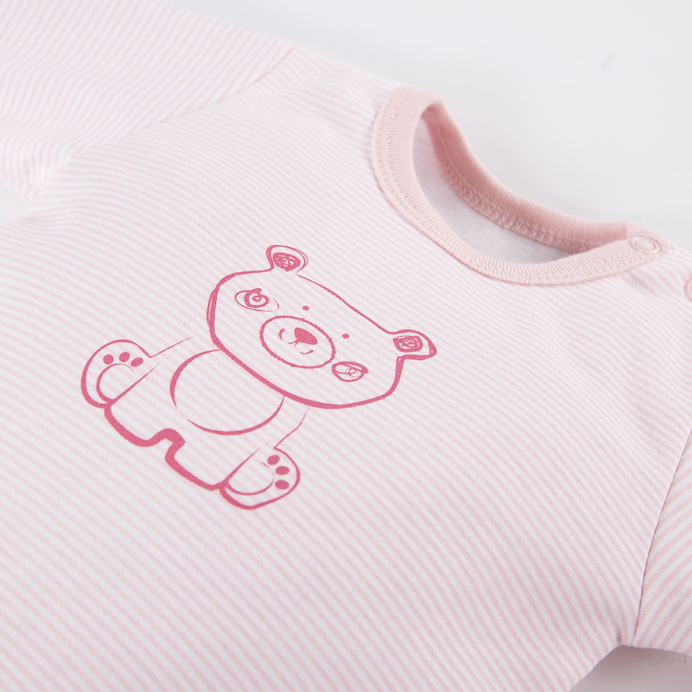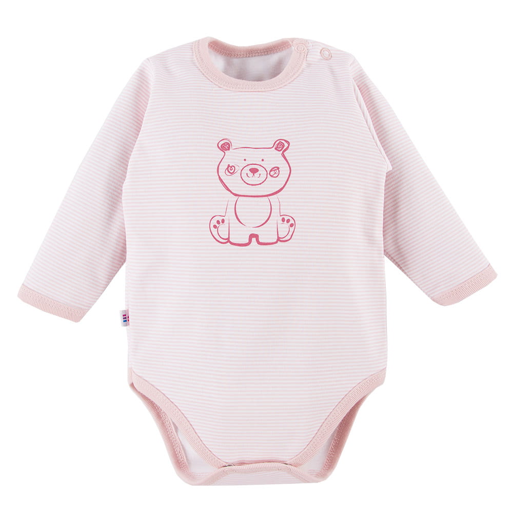 Pink bodysuit in stripes with a teddy bear. Children's bodysuit will be perfect for smaller children. They are also perfect for children up to 2 years of age in winter. Moms most often choose bodysuits for their babies. It is a must have for every baby or preschool layette.