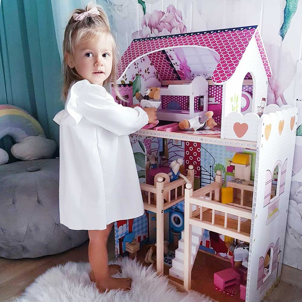 A practical back neck fastening with two buttons makes dressing easy, while the long sleeves make it perfect for cooler days and special occasions.