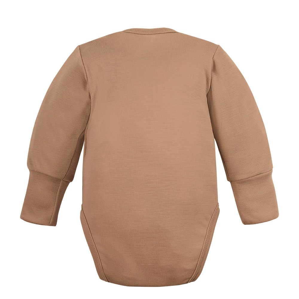 Caramel merino wool bodysuit is an exceptionally soft and functional garment for older babies and toddlers. Made from 100% high-quality merino wool, it provides excellent thermoregulation – keeps warm on colder days while remaining breathable and moisture-wicking for year-round comfort.
