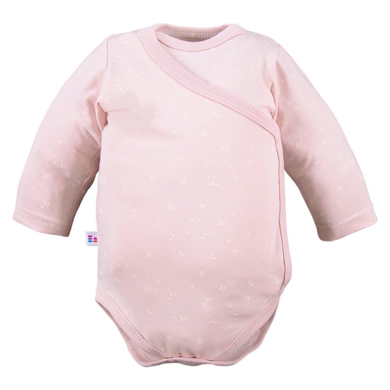 Pink wrap baby bodysuit with long sleeves in a delicate, trendy floral pattern is a functional and comfortable choice for infants in their first months. The subtle floral design gives the outfit a stylish and childlike charm.