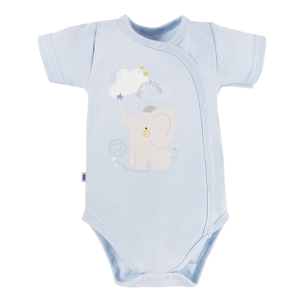 Short-sleeve baby bodysuit from the Mellow collection in blue color is made from soft, pleasant-to-touch cotton fabric, ensuring comfort and safety for your baby's delicate skin. The front of the bodysuit features a cute elephant motif, adding a subtle and playful charm.