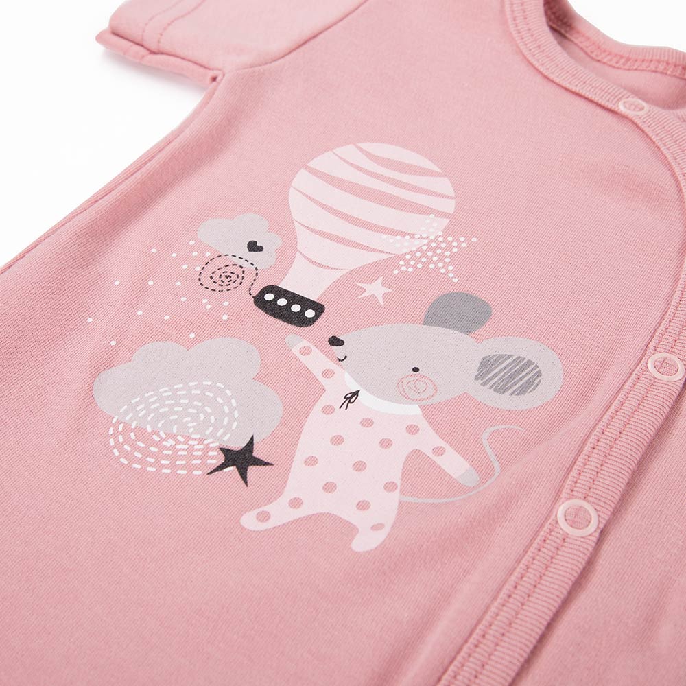 Short-sleeve baby bodysuit from the Mellow collection in pink color is made from soft, pleasant-to-touch cotton fabric, ensuring comfort and safety for your baby's delicate skin. The front of the bodysuit features a cute mouse motif, adding a subtle and playful charm.