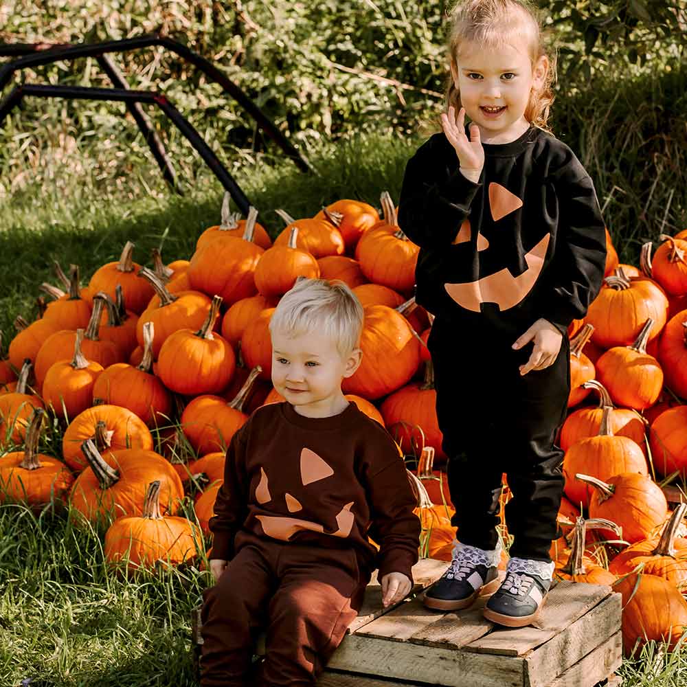 A cozy and soft children’s tracksuit from the Halloween Collection in a chocolate brown shade. Made from brushed cotton sweatshirt fabric with a soft inner fleece for extra warmth and comfort. The pullover sweatshirt features a fun spooky face print, giving it a playful Halloween vibe. The set includes matching jogger-style pants with an elastic waistband.Why choose children’s tracksuits from Eevi?