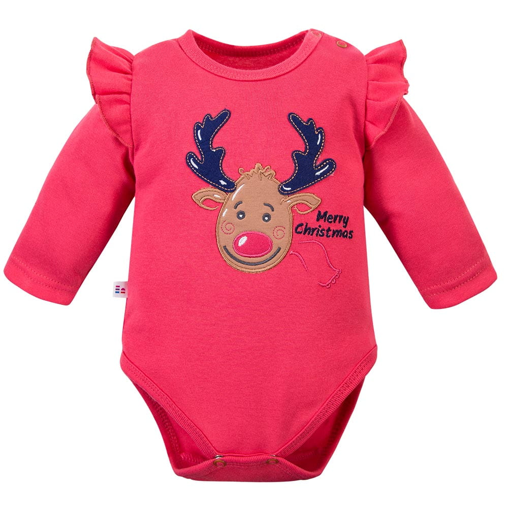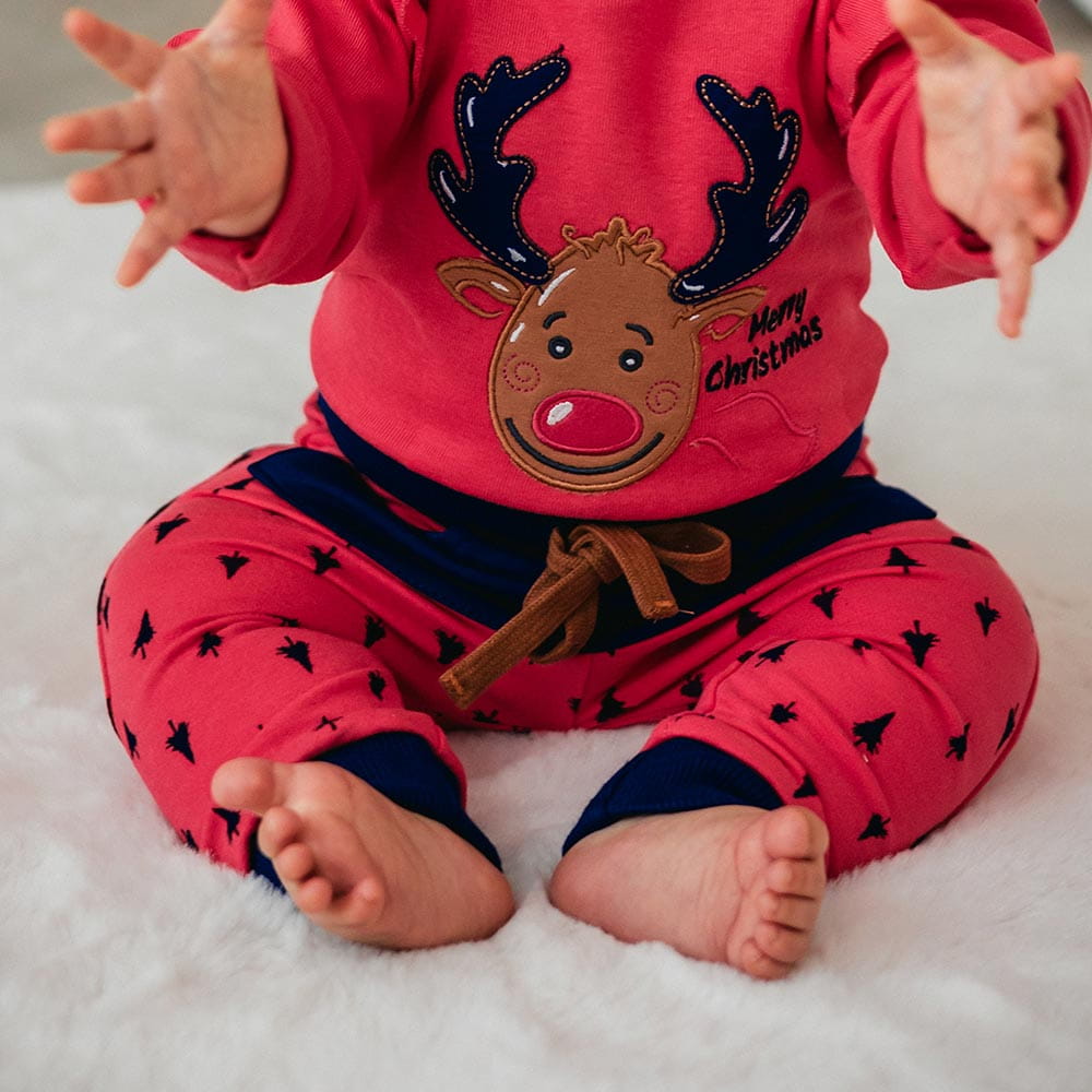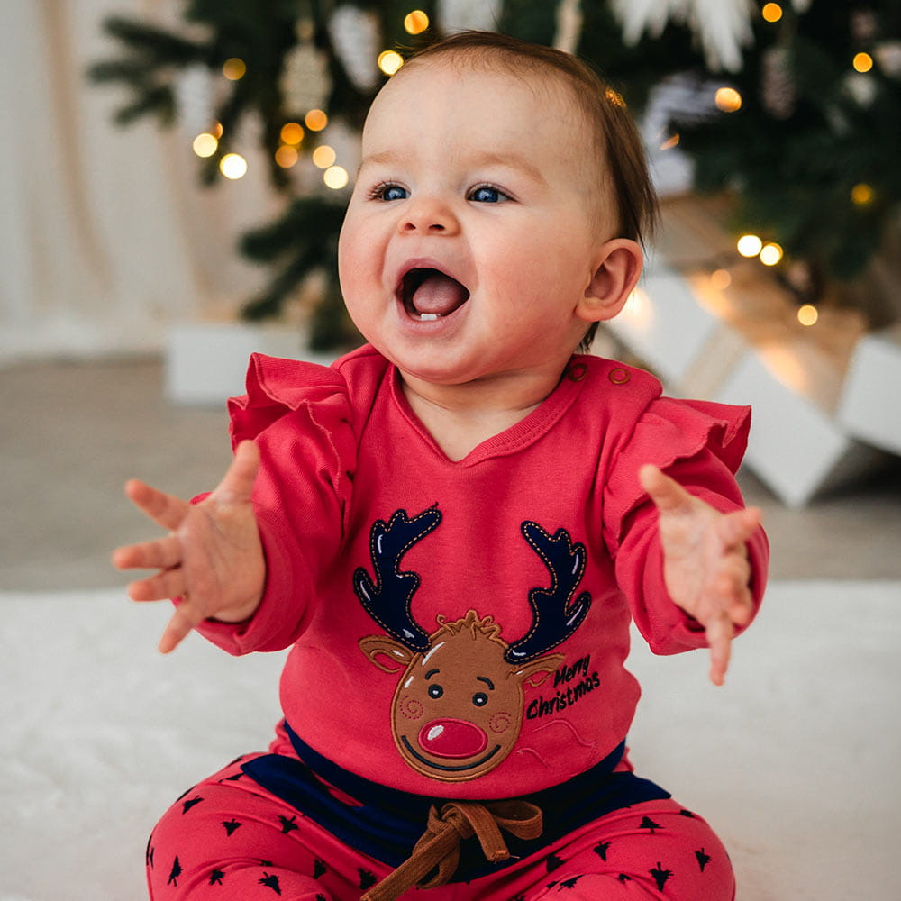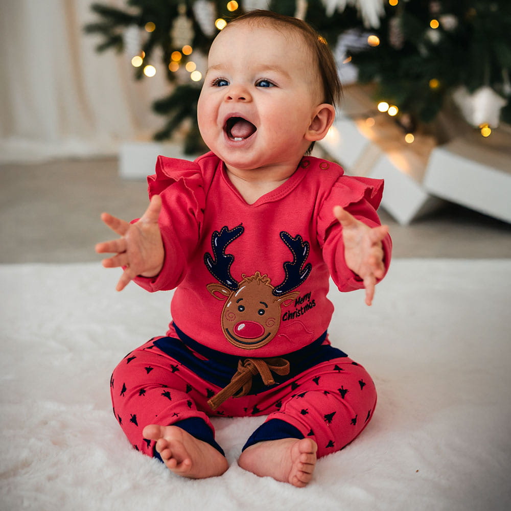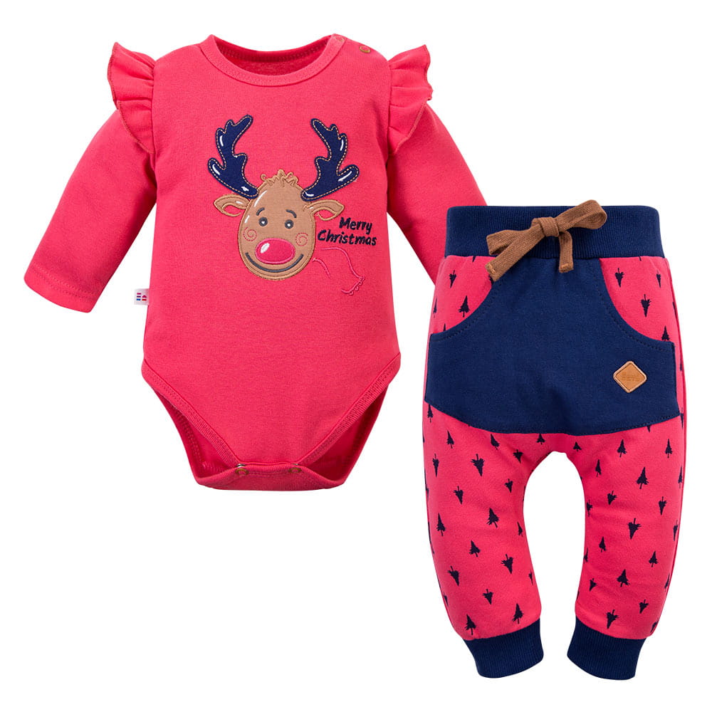 A charming Christmas set for the little ones, made of soft, skin-friendly cotton. The set includes a bodysuit decorated with a festive embroidery and comfortable raspberry-colored pants, creating a harmonious and unique holiday outfit. Perfect for family gatherings, Christmas photo sessions, and winter days filled with magic.