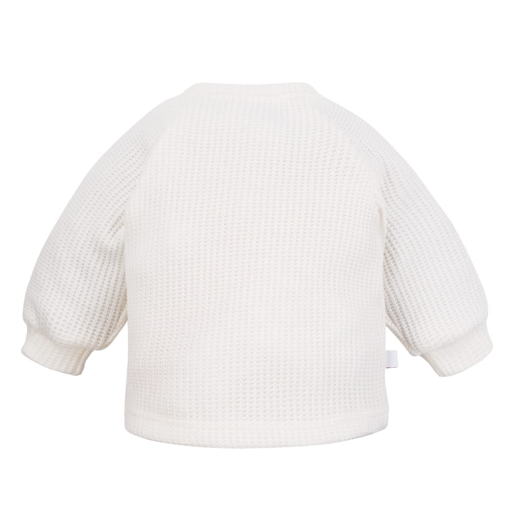 Stylish ecru baby sweater from the Fluffy Tails collection made of soft, waffle-knit fabric. This charming design features delicate bows on the shoulders, adding a sweet and feminine touch. Front button closure makes dressing your little one easy and ensures comfort throughout the day.