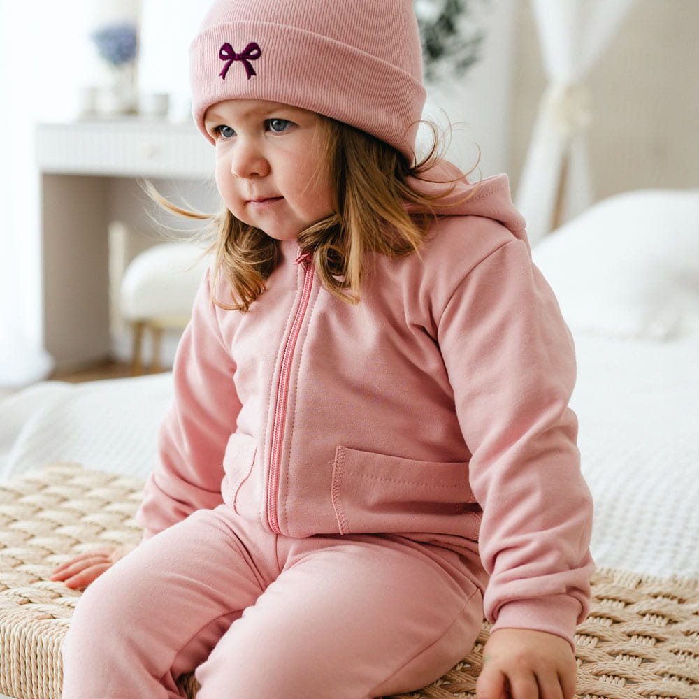 Girls' pink tracksuit from the Fluffy Tails collection is a soft everyday set - a hooded zip-up sweatshirt and classic sweatpants. The smooth fabric highlights the style, while the squirrel embroidery on the back adds a charming touch. Perfect for nursery, walks and at-home play.Why choose girls' tracksuits from Eevi?