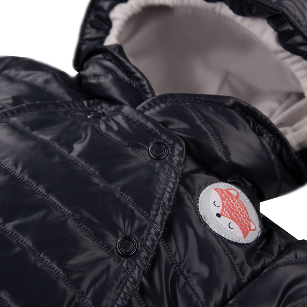 Overall with feet from ADVENTURE collection in four color versions, made of soft and pleasant to the touch fabric, which is an excellent protection for the child against cold, rain and wind. It has an additional layer of undersuit. An elastic band has been sewn in the hood of the suit, which prevents the hood from coming off and protects the baby's head from the cold. On the front there is a patch with a fox.