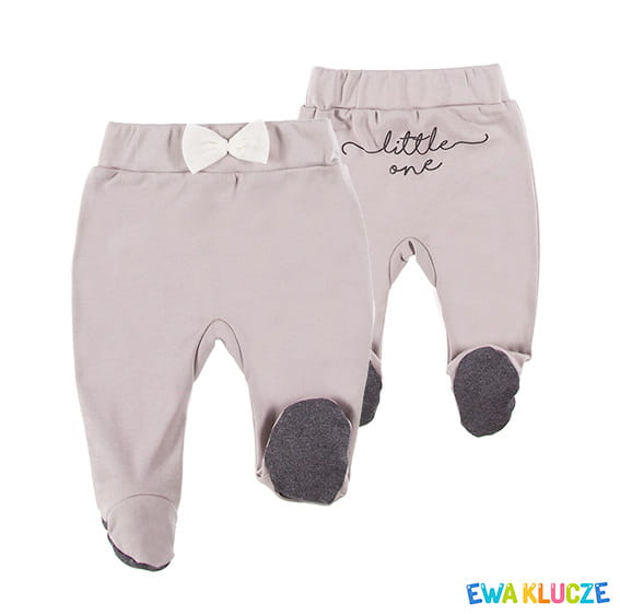 Joggers with feet from EMU collection, made of soft and pleasant to the touch knit. The waistband has a puller and a rubber that does not affect the child's tummy. The front has a small tulle bow. The is a print on the back.The waistband has a puller and a rubber that does not affect the child's tummy. The front has a small tulle bow. Manufactured in Poland, granted the "Safe for Children” certificate. 100% cotton