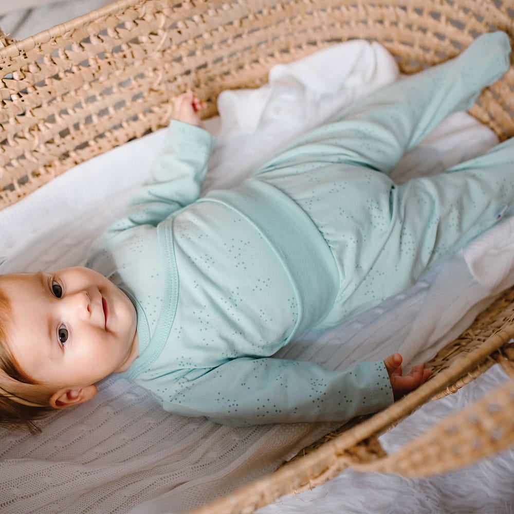 Green baby footed joggers with a delicate print are a practical and versatile part of a baby’s wardrobe. They are perfect for every season – both for babies born in winter and summer. They provide comfort, freedom of movement and the right amount of warmth every day.