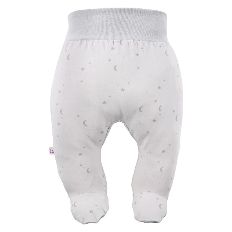 Baby footed joggers in grey with a delicate star pattern are a universal choice for infants throughout the year. They are suitable for babies born in winter as well as in summer, providing thermal comfort and freedom of movement.
