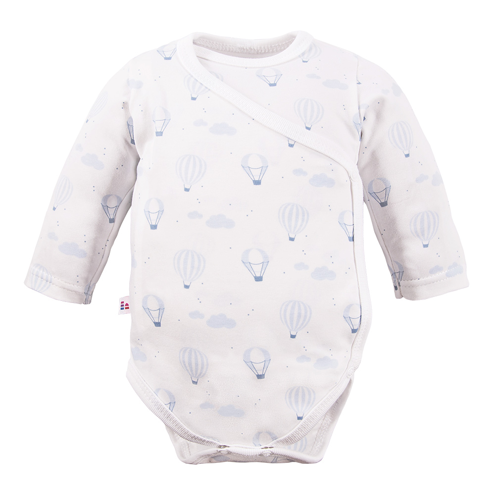 The color palette in shades of blue, white and ecru with a delicate balloon and cloud motif makes this a stylish and practical newborn set.