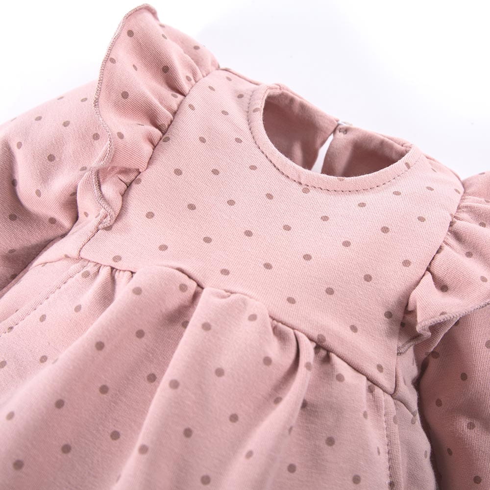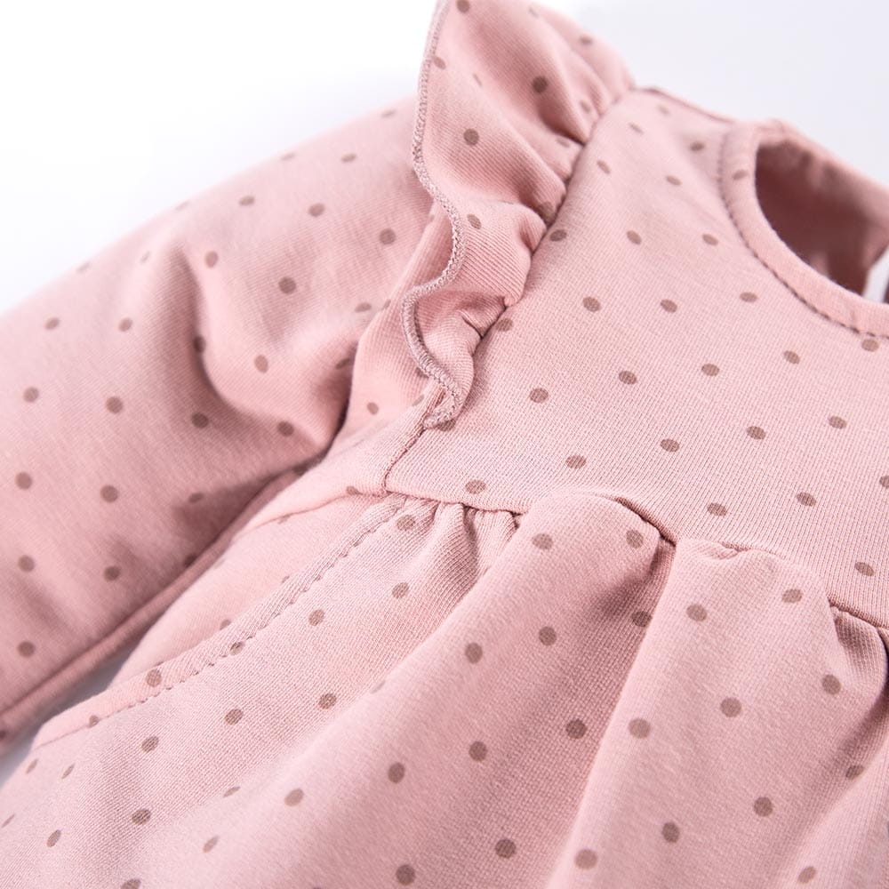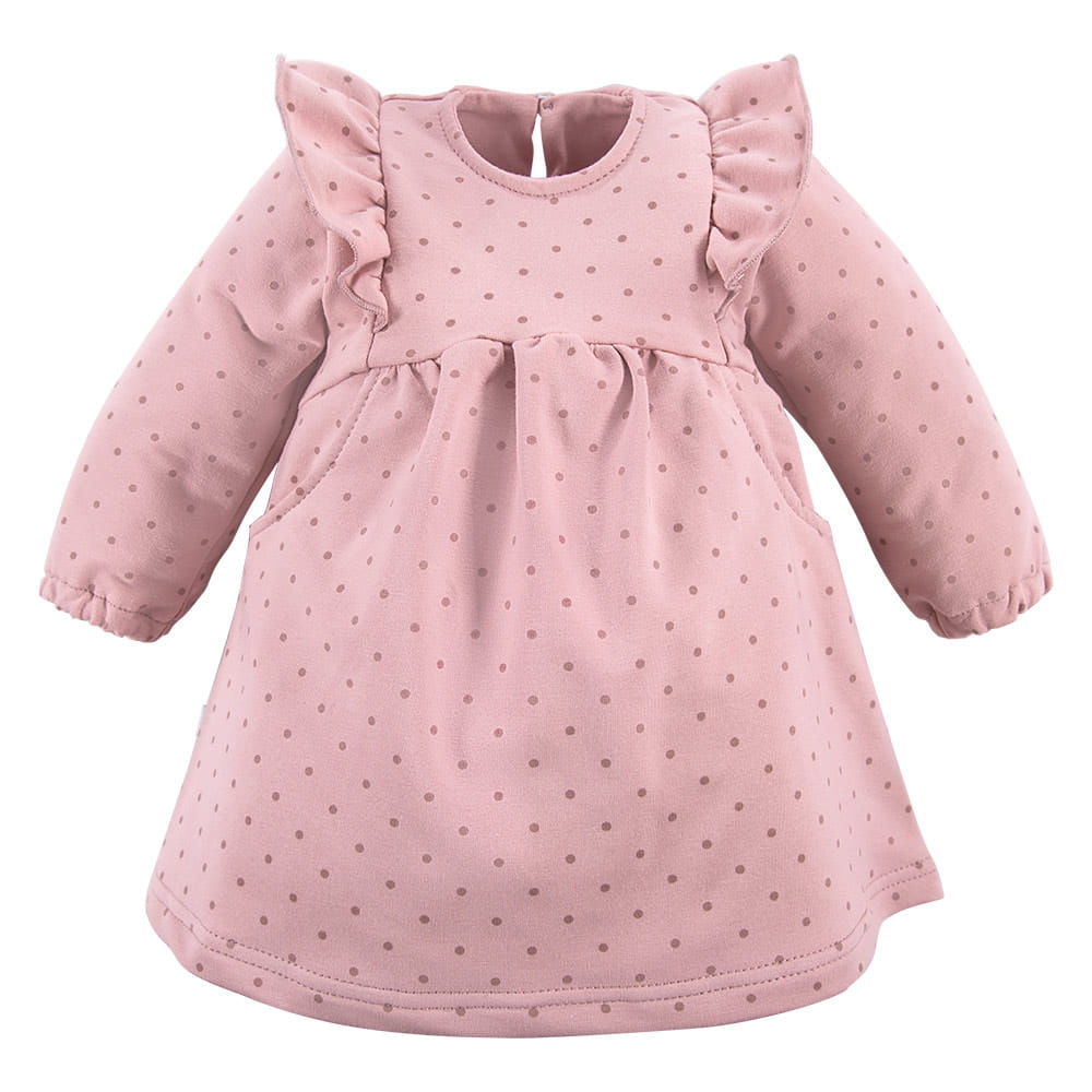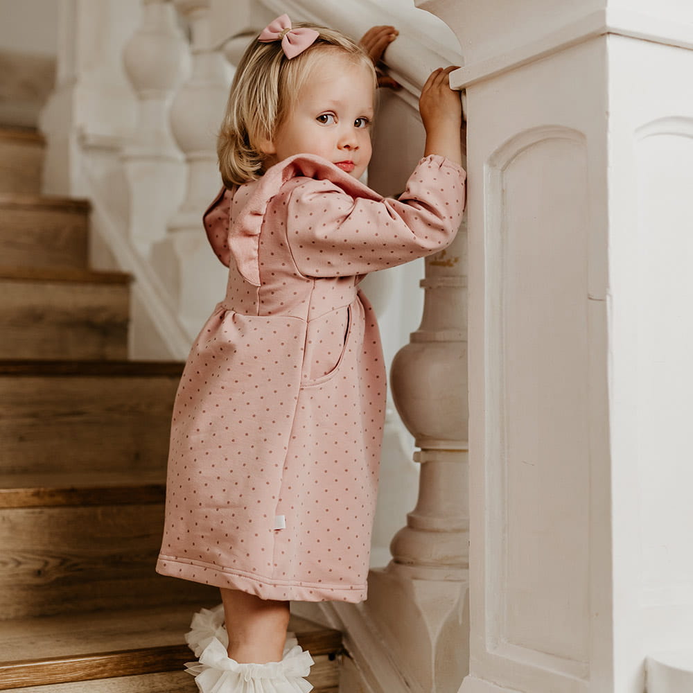 Children's dress with frills, made from soft and touch-friendly sweatshirt knit fabric. The dress has a back zipper for easy dressing and decorative frills for added charm.