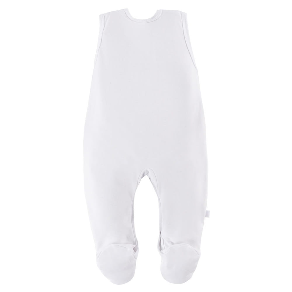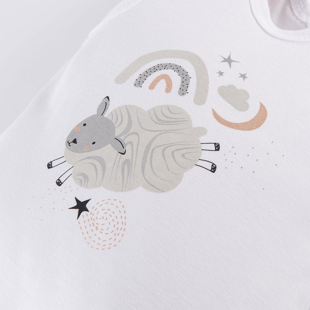 White baby rompers from the Mellow collection are made of soft and pleasant-to-the-touch cotton knit fabric, ensuring comfort and safety for delicate baby skin. The front features a large sheep print. The practical design allows for full opening, making the romper functional and convenient. The edges are finished with a soft trim. Despite their name, parents often dress their babies in these rompers not only for sleeping. Paired with a matching cardigan from the same collection, they create a charming going-out outfit.