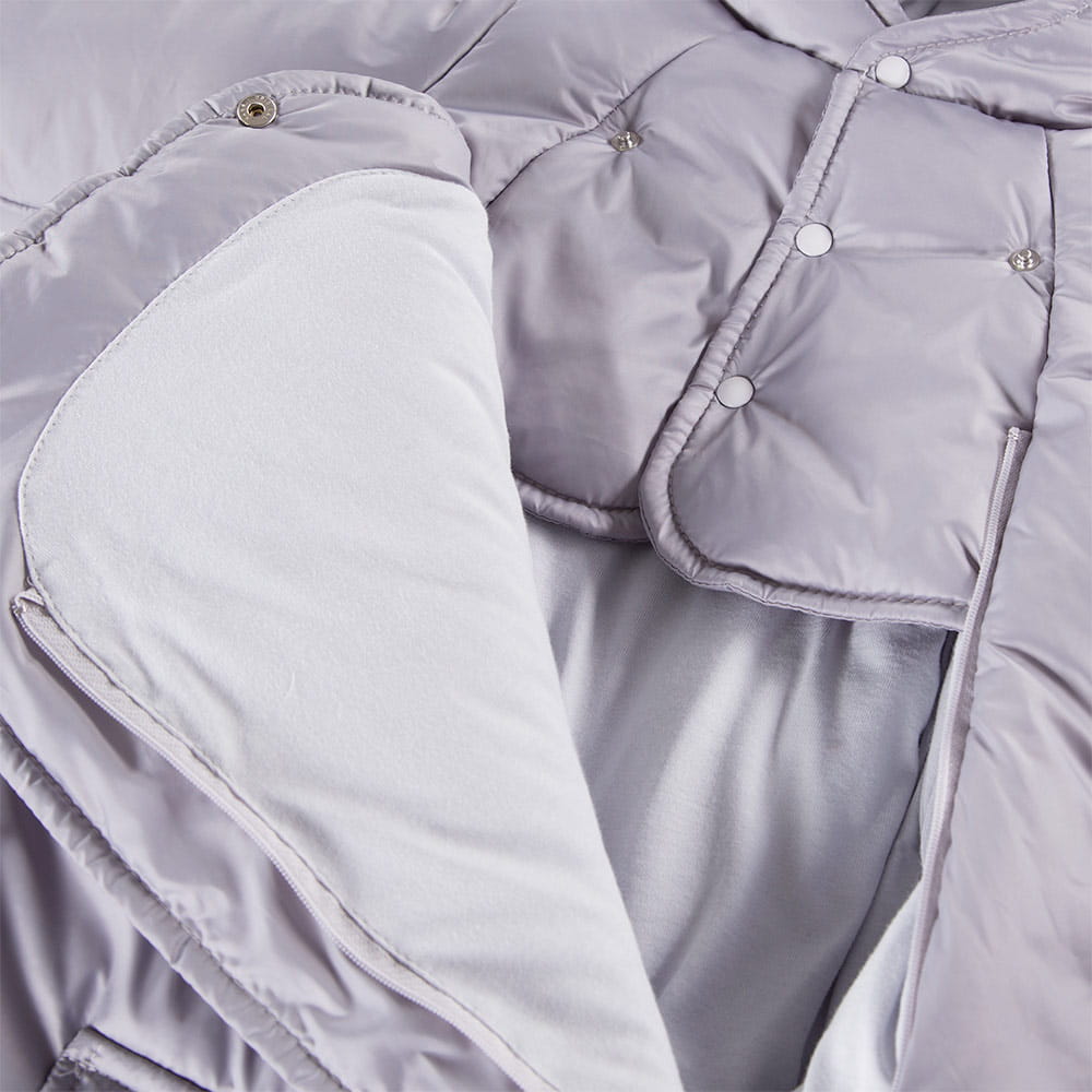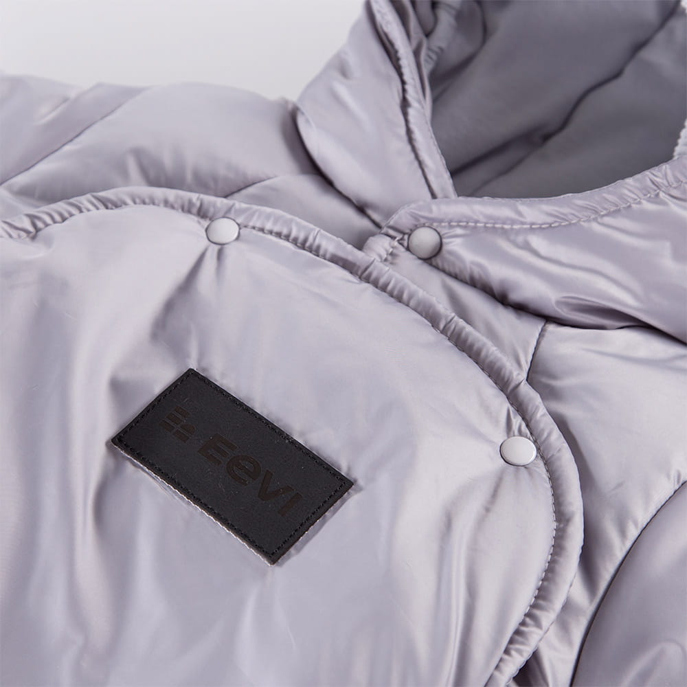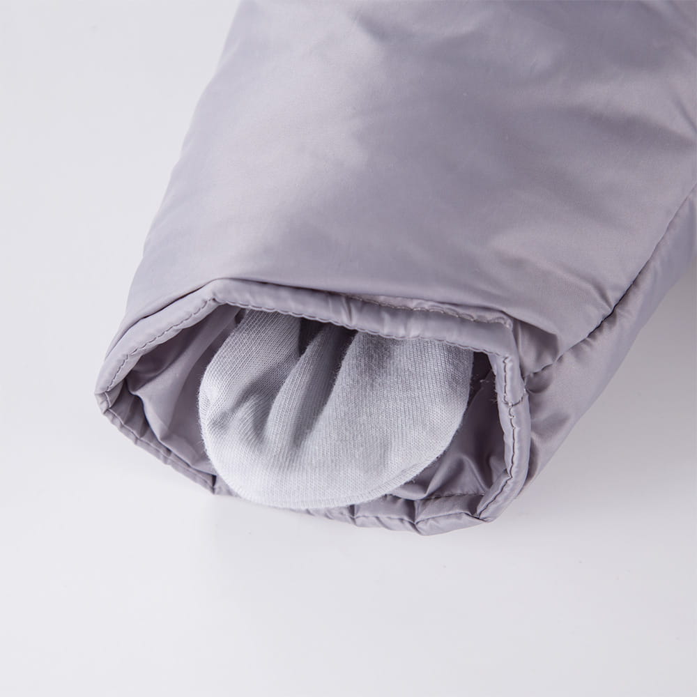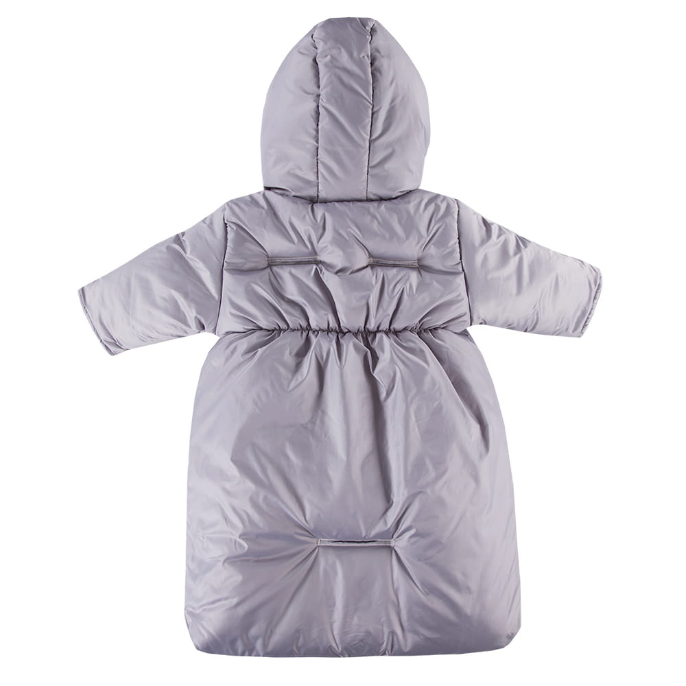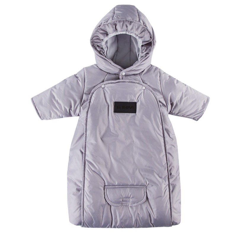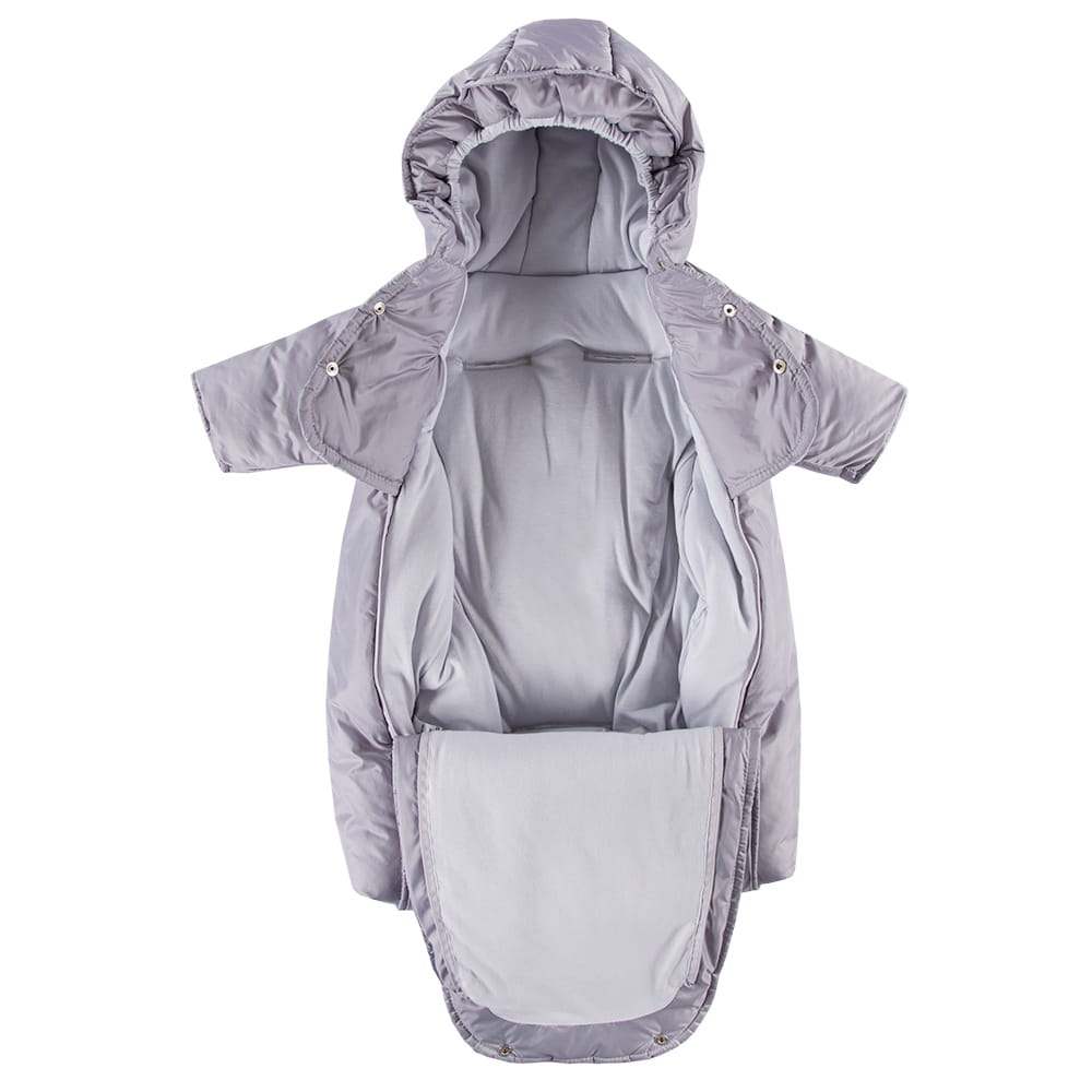 - The jumpsuit fits prams, carriers, and car seats, with openings for safety belts.