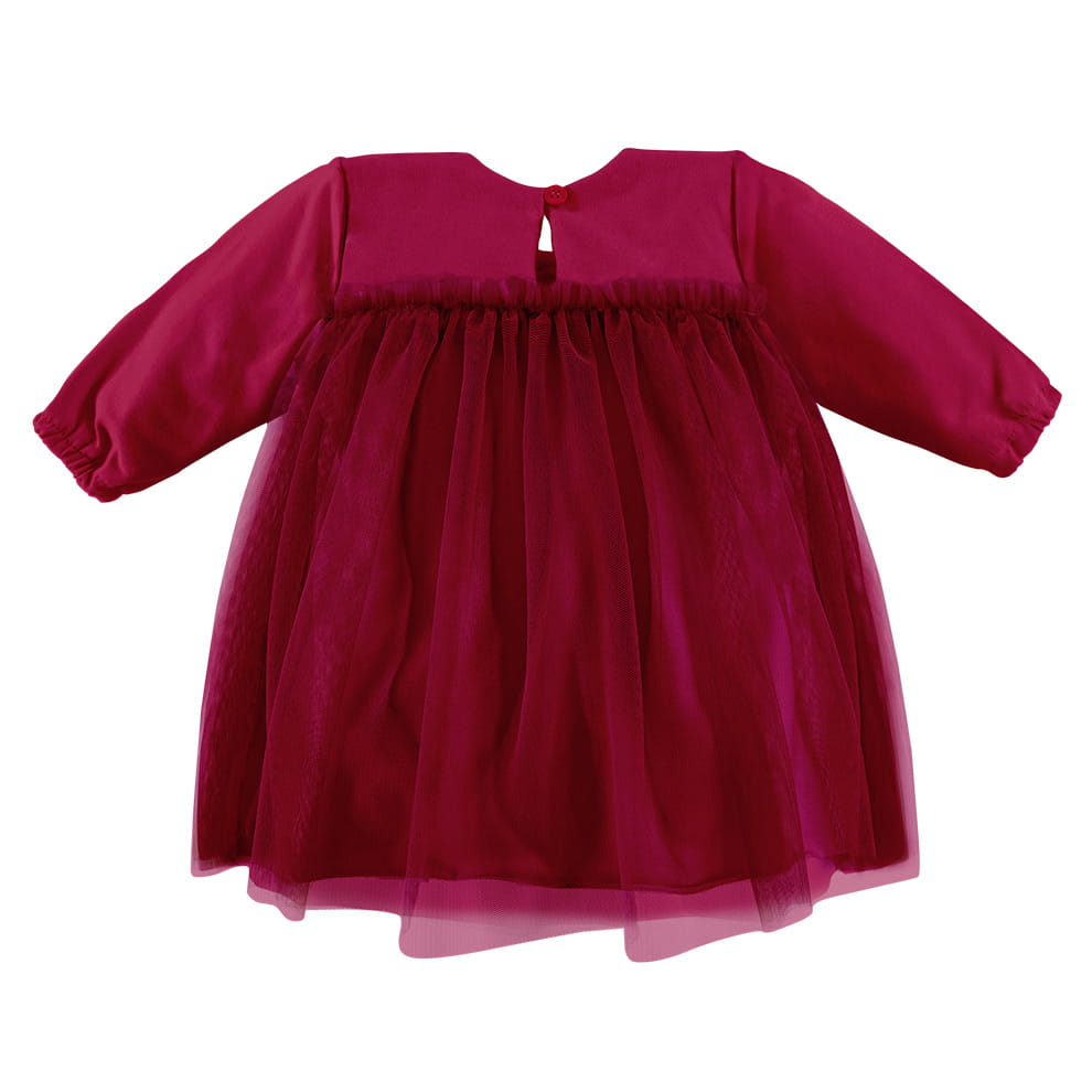 The delicate tulle layer adds elegance and lightness, while the flared cut flows beautifully with movement. The puffed sleeves enhance its girly character, and the practical button fastening at the back makes dressing easy.